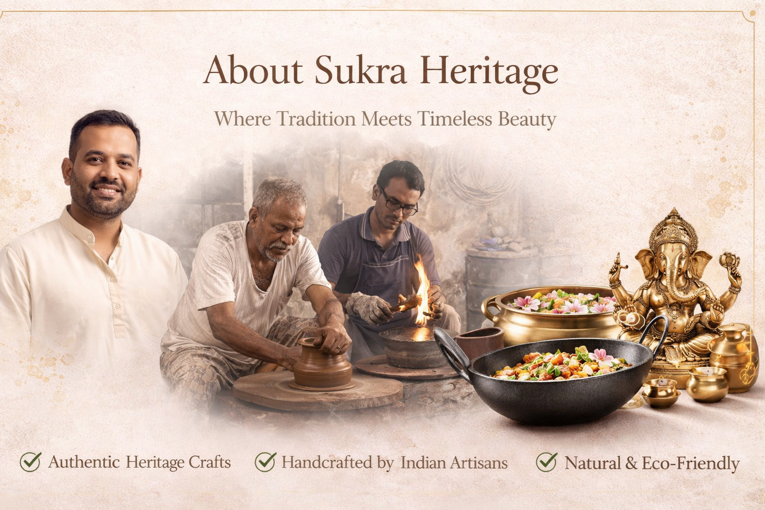 Sukra Heritage began its journey in 2020, inspired by a deep love for traditional Indian kitchenware, home décor, and natural living. What started as a small passion soon became a mission — to bring back the beauty of handcrafted, natural, and sustainable products into modern homes.